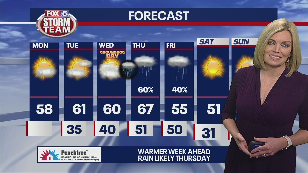 After a few days of chilly weather, Monday will be variably cloudy with highs in the upper 50s. Temperatures in the 60s will be more widespread Tuesday through Thursday.