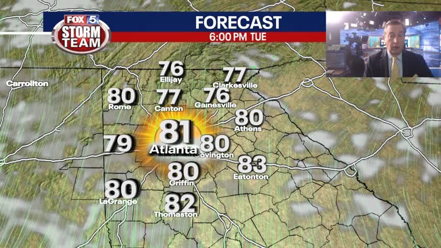 Mostly cloudy and mild for Monday night with lows into the 50s by morning. Early Tuesday a few spots in NW GA could see a brief shower, otherwise partly cloudy and very warm on Tuesday with highs near 80. Here is the latest.