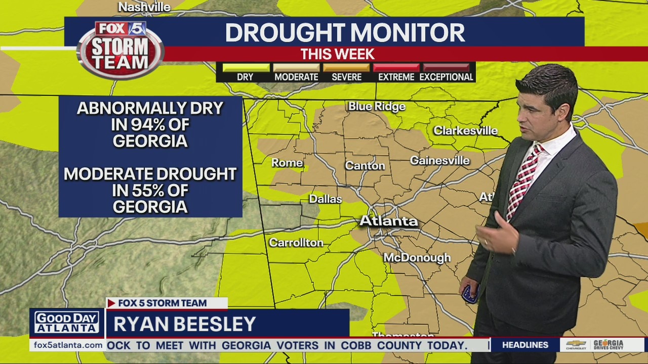 Early sunshine, followed by clouds and more scattered storms. Potential for storms in northeast Georgia around midnight on Monday.