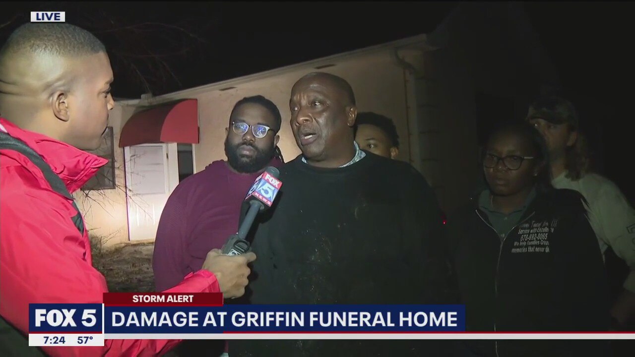 The owner of a local funeral home in Griffin says he's fortunate his staff and family are safe after violent storms brought down a tree onto his establishment. He told FOX 5 he believes a tornado ripped through the area. He also says his life's work will likely have to be torn down.