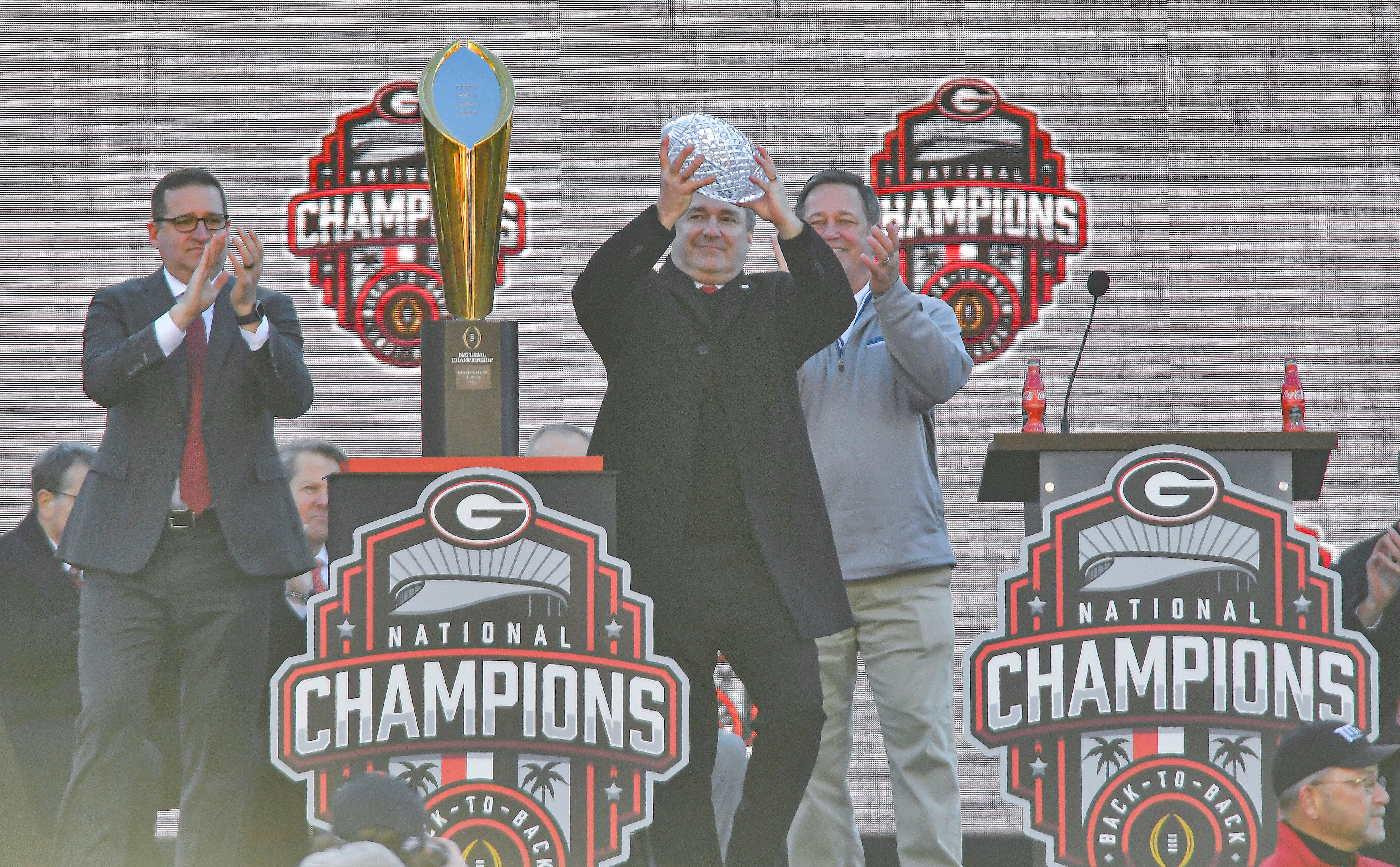 Athletic Director Josh Brooks and Coach Kirby Smart were presented with the $30,000 hollow football trophy decked out in crystals.