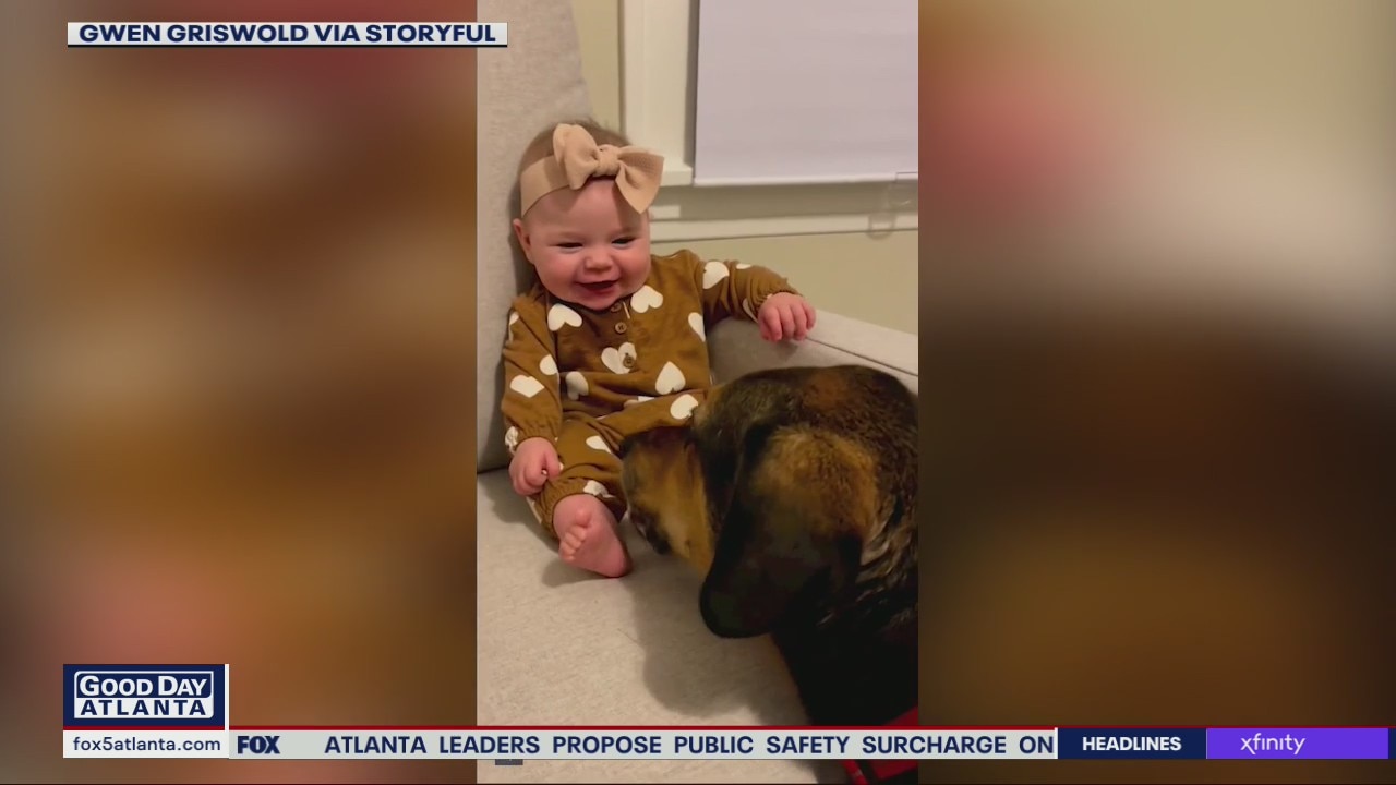 Baby can't control her laugh as pooch pal licks her