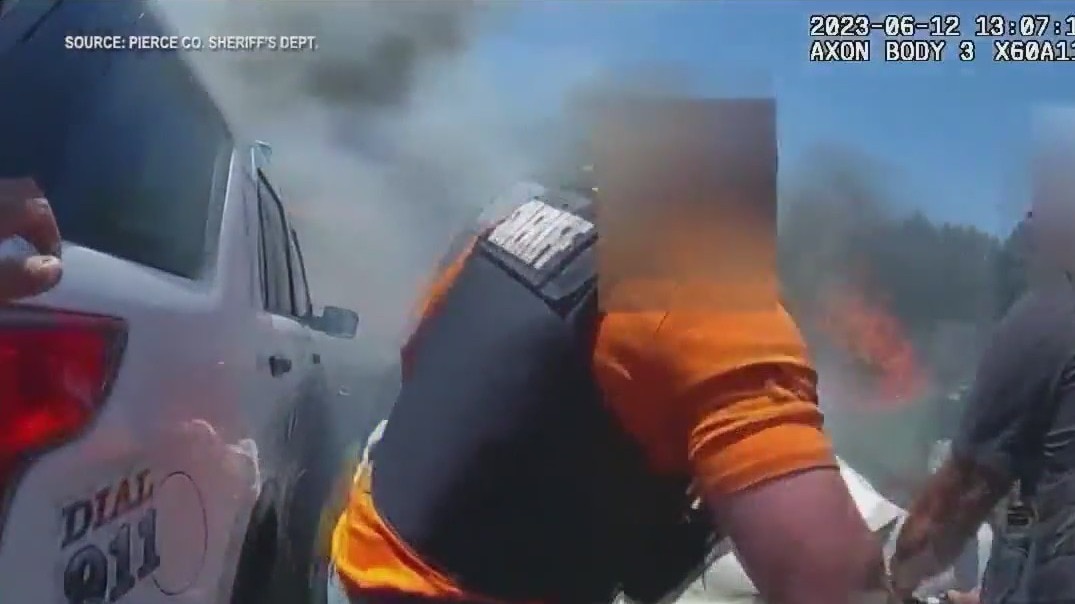 New body camera video shows how police officers pull a woman and carjacking suspect from a car in Washington state.