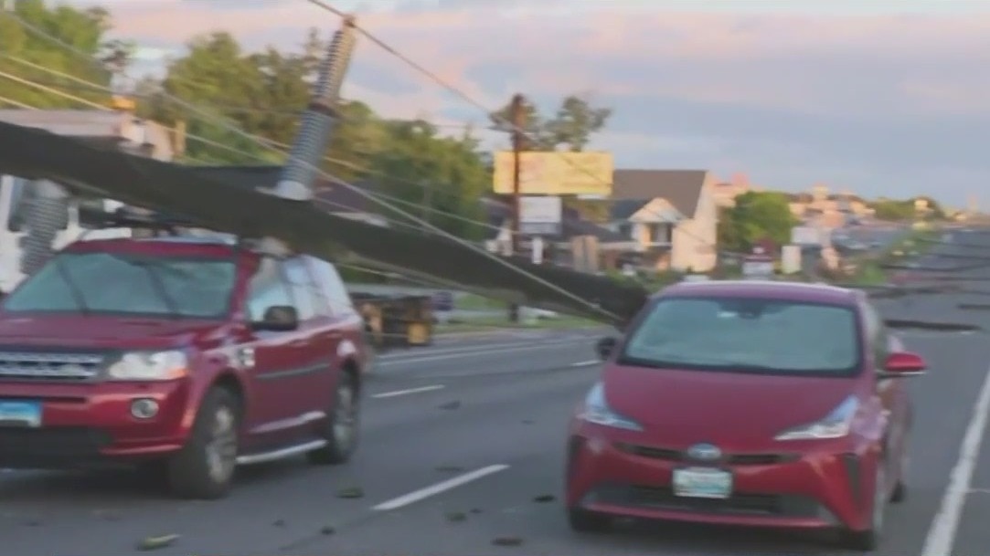 A wild scene in Westminster, Maryland where several people got trapped in their vehicles as a powerful storm knocked down a series of power poles onto the roadway.