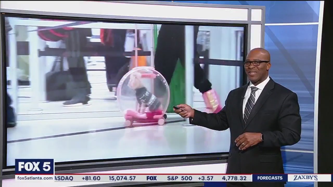 FOX 5 photographer Billy Health captured a four-legged friend traveling in style while rolling through the busy Atlanta airport.