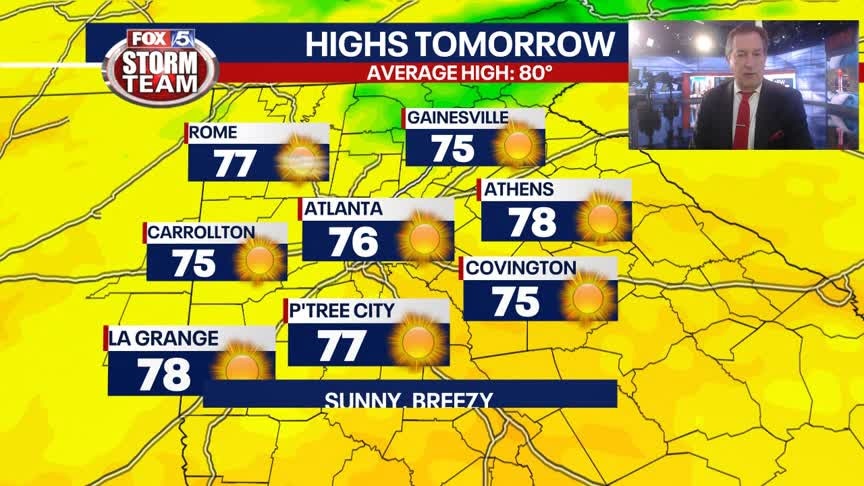 A clearing sky with a breeze and falling temps will be the rule across North Georgia Friday night. Temps by Saturday morning will be refreshngly cool, in the 40s in the mountains and 50s elsewhere. Sunny thru the day with highs holding in the mid 70s, still breezy at times. Sunny and real nice for Mom on Sunday with highs near 80. More storms next week. Here is the breakdown.