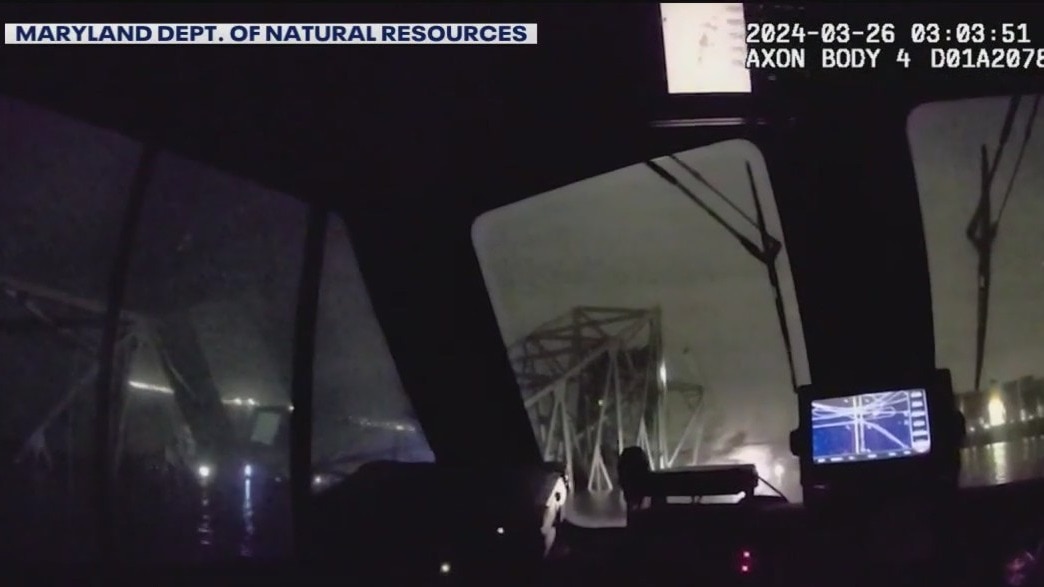 New body camera video shows the initial shock among first responders. After the collapse of the key bridge in Baltimore last month. Officers from Maryland's Department of Natural Resources arrived about an hour after impact and began to circle the area in search of survivors.