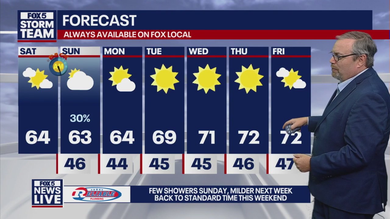 Don't forget to set your clocks back! Parts of Georgia will wake up to showers on Sunday. Meteorologist Greg Majewski says milder conditions should be headed our way next week. Here's a look at your FOX LOCAL weather forecast.
