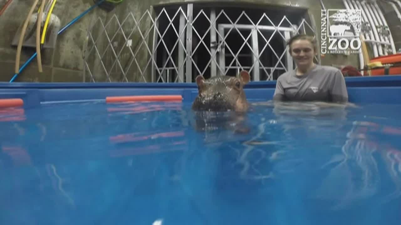 BABY HIPPO TAKES A DIP IN THE POOL