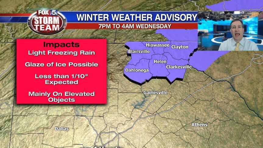 Cloudy and cool overnight with showers developing by morning. With colder air wedged into NE GA, there is a possibility for freezing rain in extreme NE GA. Look for rain and t-storms for the rest of metro ATL by Wednesday evening. Here is the outlook: