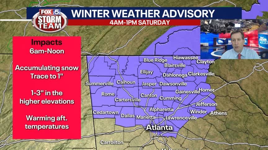 Snow is in the forecast for North Georgia. Quiet tonight and getting colder, then the precipitation begins by 7am Saturday morning. A Winter Weather Advisory is in effect for areas north of I-20. Here is the latest info.