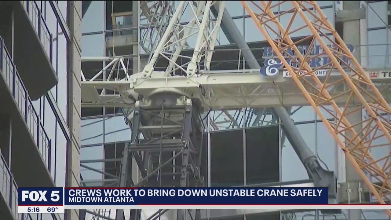 Crews in Midtown Atlanta are continuing work to bring down an unstable crane. Officials expect West Peachtree Street to be closed throughout the week.