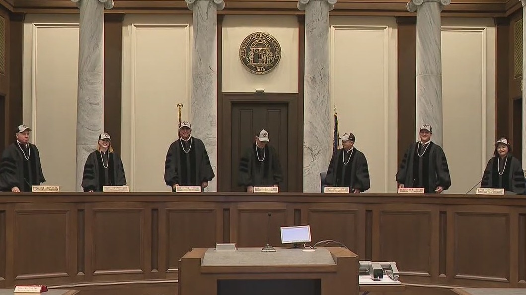 All 9 of Georgia's Supreme Court Justices wore Braves hats and pearls during a special session on Thursday.