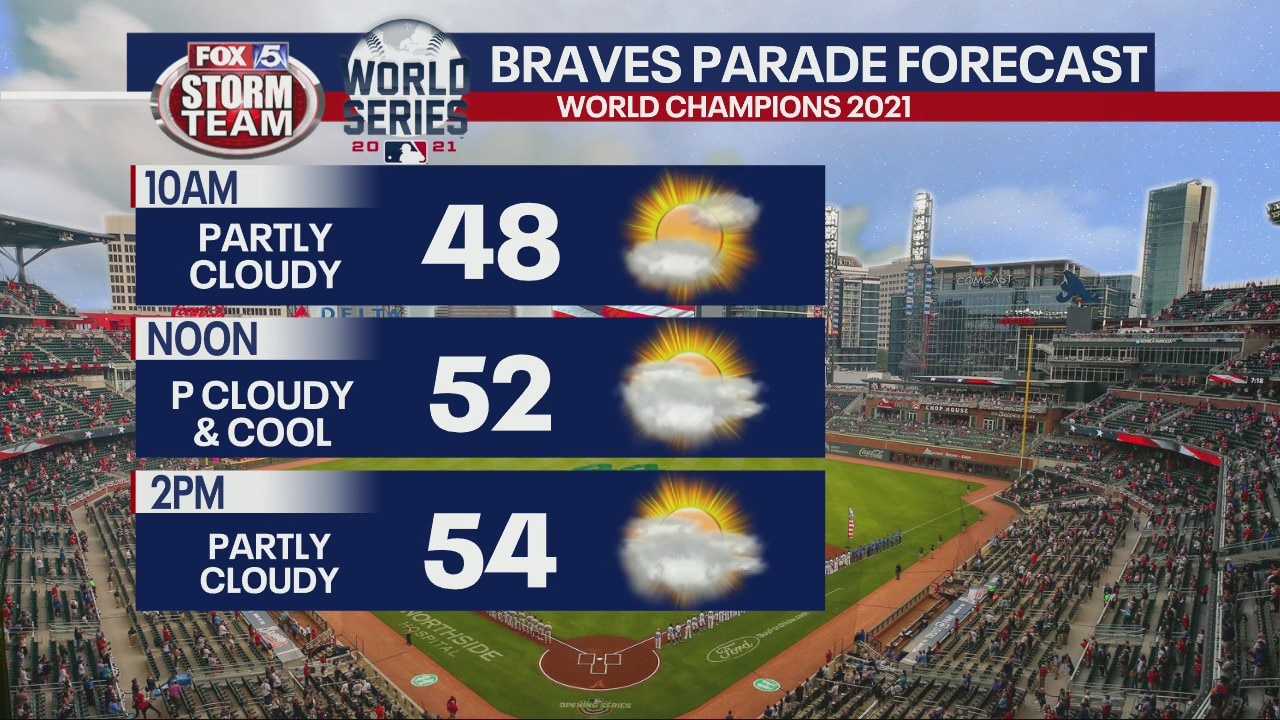 FOX 5 Storm Team Chief Meteorologist takes a look at Wednesday's forecast and fast-forwards to check out the forecast on Friday for the scheduled parade to honor 2021 World Series Champions the Atlanta Braves.