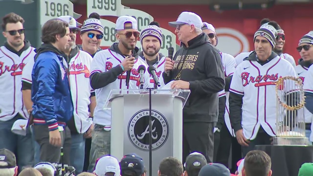 Eddie Rosario during the Braves World Series celebration at Truist Park on Nov. 5, 2021 said he was nervous speaking to the crowd, but thanked Atlanta for embracing him.