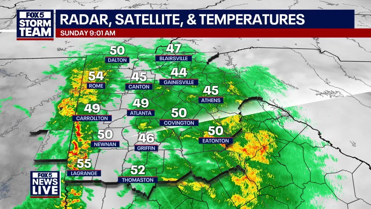 A soggy Sunday is in the forecast for metro Atlanta as rain continues through much of the day. Meteorologist Alex Forbes and the FOX 5 Storm Team are tracking a 100% chance of rain that will wash out outdoor plans. While North Georgia deals with the rain, Southeast Georgia is under a Level 2 risk for severe storms, including the potential for isolated tornadoes. Dry weather and a significant warm-up arrive just in time for Presidents Day.