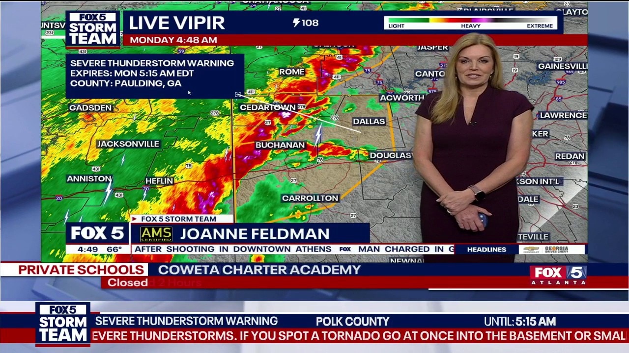 Here are the area that are under severe thunderstorm warnings at 4:45 a.m. Monday, March 16.