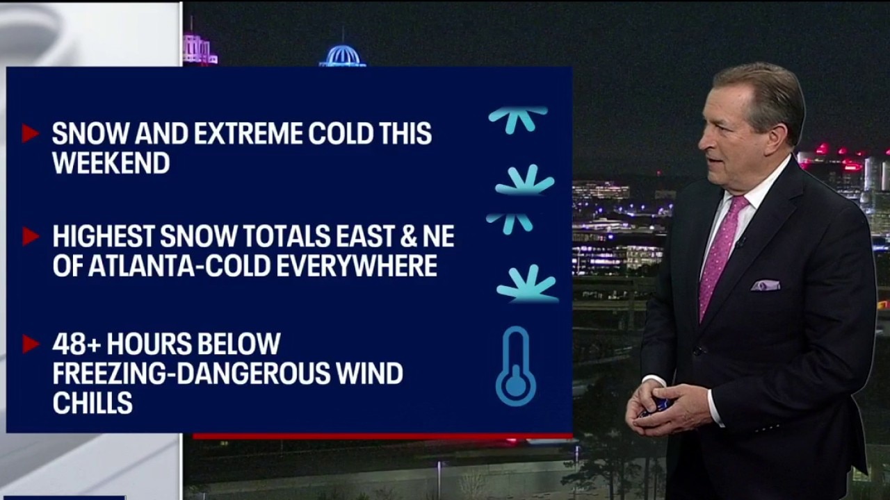Period of snow Saturday with the heaviest east of metro Atlanta. Extreme cold into Monday.