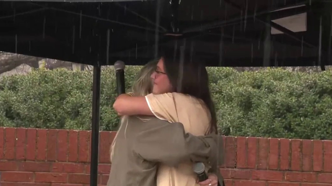 Lauren Riley addresses a crowd gathered to remember her sister, Laken Riley, a nursing student killed while running on UGA's campus.