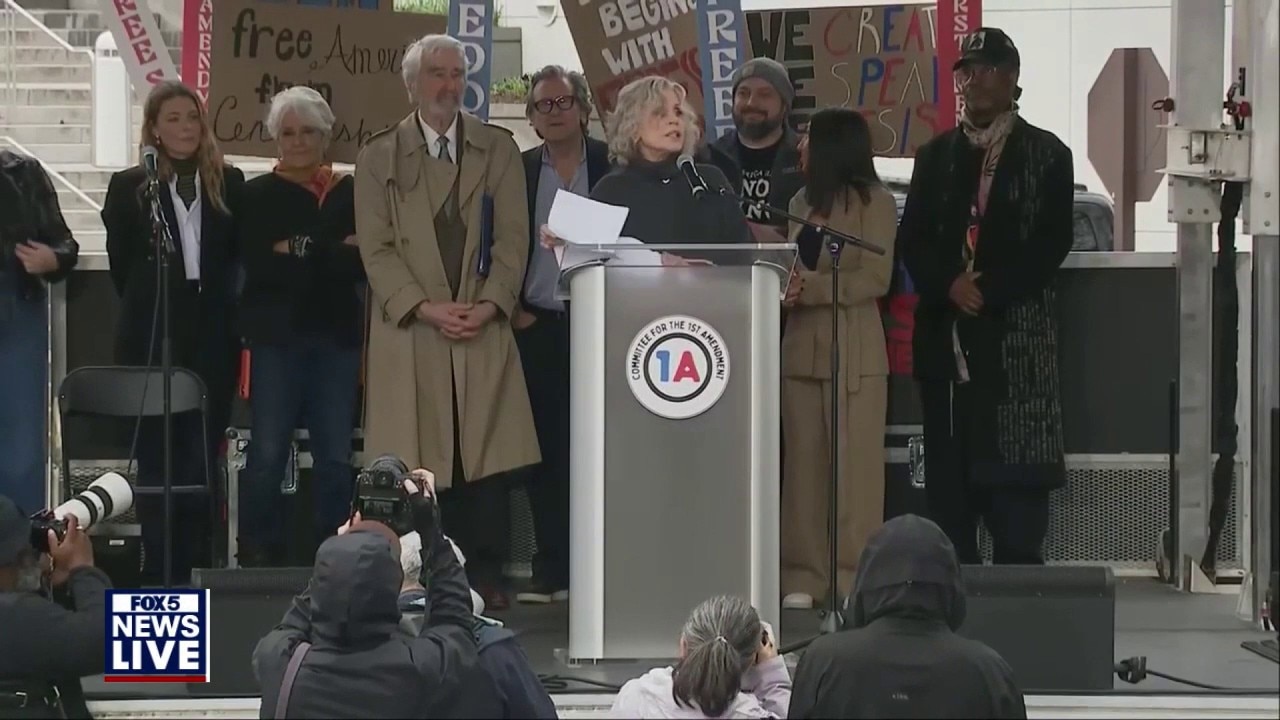 Actor Jane Fonda and several other celebrities held a rally outside the Kennedy Center in Washington D.C called "Artists United for Our Freedoms." The rally was in effort to speak out against the "takeover" of the arts center by the Trump administration.