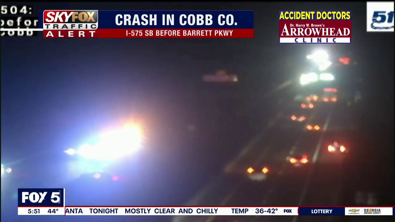 A crash on I-575SB in Cobb County was blocking all lanes shortly before 6 a.m. Friday. Other drivers are advised to seek alternate routes such as Canton Highway to avoid delays.