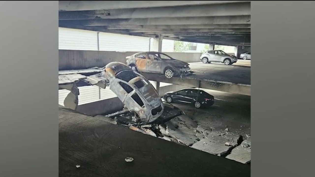A Brookhaven parking garage partially collapsed after multiple cars in it caught fire on Friday night.