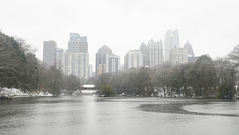 The Atlanta skyline is framed by snow at Piedmont Park following a snow storm on Jan. 10, 2025 in Atlanta, Georgia. (Photo by Megan Varner/Getty Images)