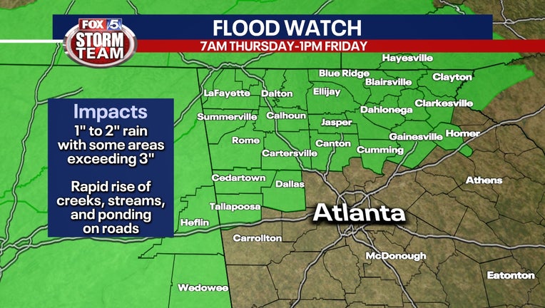 A Flood Watch has been issued for Cherokee, Dawson, Fannin, Forsyth, Gilmer, Hall, Lumpkin, Pickens, Union, Banks, Towns, White, Bartow, Catoosa, Chattooga, Dade, Floyd, Gordon, Murray, Walker and Whitfield counties through Friday afternoon.
