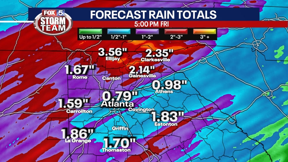 The FOX 5 Storm Team says 1 to 2 inches of rain is possible over the next few days with some areas exceeding 3 inches. The biggest concern will be rapidly rising creeks, streams, and possible ponding on roadways.