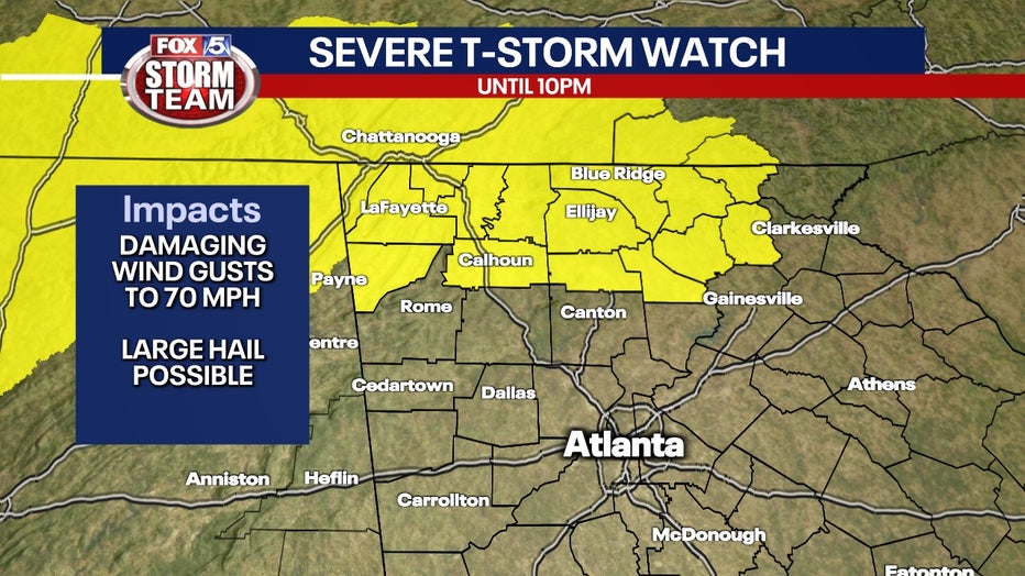 A Severe Thunderstorm Watch has been issued for Catoosa, Chattooga, Dade, Dawson, Fannin, Gilmer, Gordon, Lumpkin, Murray, Pickens, Towns, Union, Walker, White, and Whitfield counties until 10 p.m.