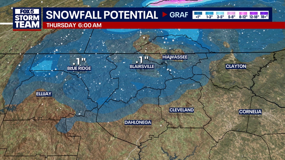"It’s going to be the mountain tops up in Northern Georgia that’s going to have the decent chance of seeing some snow," Forbes said. "Up to a half inch of accumulation will be possible, and some higher amounts above 2,500 feet."